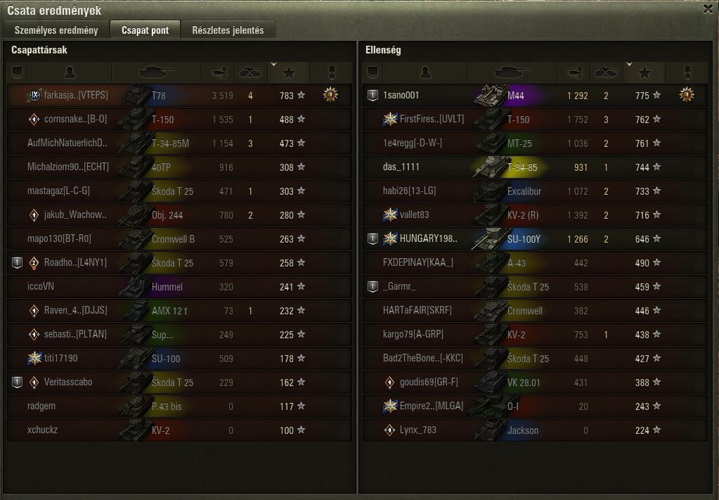 Csak a napi küldiket meg a tank wars-t akarom megcsinálni, de nem fogom egyiket se, mert ilyen nyomorult játékkal nem vagyok hajlandó játszani. Talán javul később a helyzet.Az, hogy a csapat túlnyomó része passzív, semmitérő játékos, úgy lesz döntetlen, hogy 5 tank, köztük 1 közel full hp-n nem mernek se foglalni se előre menni és 8 percen keresztük nézik a semmit. 2 megmaradt ellenség volt, de már 3 tankunk egyesével próbálkozott korábban és persze mind ott pusztult. A többi 5 tankunk meg úgy döntött, hogy akkor legyen döntetlen.