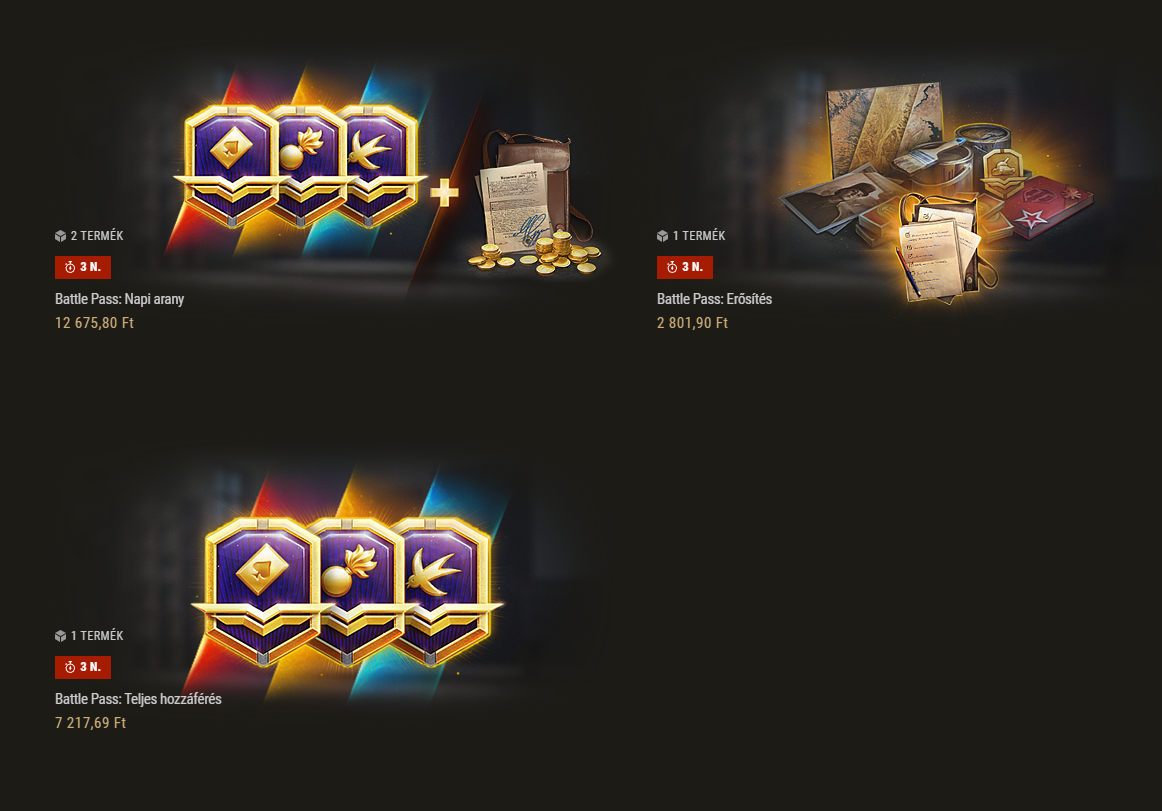 Ezenkívül megpróbálhatsz más fizetési módokat is, amelyek elérhetők a csomag megvásárlásához prémium üzletünkben: https://eu.wargaming.net/shop/