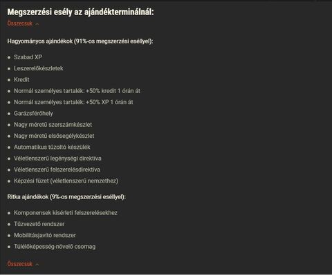 Én el nem tudom képzelni, hogy régi játékosoknak miféle cucc kéne annyira fontosan a frontline-ból. Átképzési parancs? minden legénységem beállítva, van ilyen parancsból vagy 20 fel nem használt. Kötvény? okés az jól jöhet, bár ami kötvényes tank érdekelt, már mind megvan. Kredit? na az meg végképp nem kell. Lenulláztam magam, amikor megvettem és felszereltem a jpze100-t meg az obj140-t. most újra van 10 milla kreditem, pedig nem játszottam sokat, volt, hogy egy komplett hetet kihagytam. Igaz, főleg prém tankokkal játszom. Átnéztem a garázst, eladtam 5 olyan tankot, amik valahogy bent maradtak, amikor ágat húztam és olyan sz.rok, hogy többet nem fogok velük menni soha, most van 15 millióm. Talán megveszem a tier10 bz-t belőle, az még hiányzik. Arany lőszert nem használok sokat, lesz.rom, hogy ki mennyit tölt rám, nem érdekel, én játszom a saját szabályaim alapján.