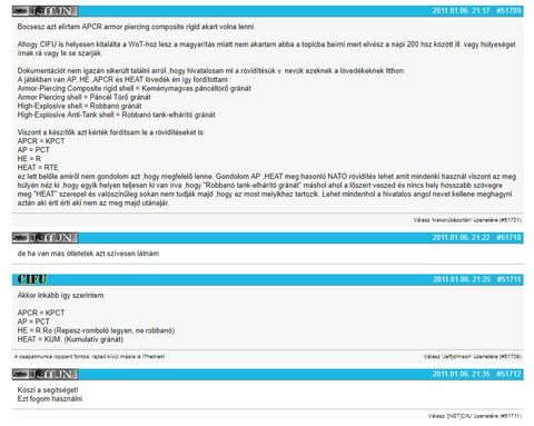 [forrás]Szerintem egyébként jobb lett volna maradni az angol verziónál és nem kellett volna saját rövidítéseket gyártani a lövedék típusokhoz. Azért érdekes beleolvasni így 8 év távlatában ezekbe a dolgokba. Magyar WoT történelem.