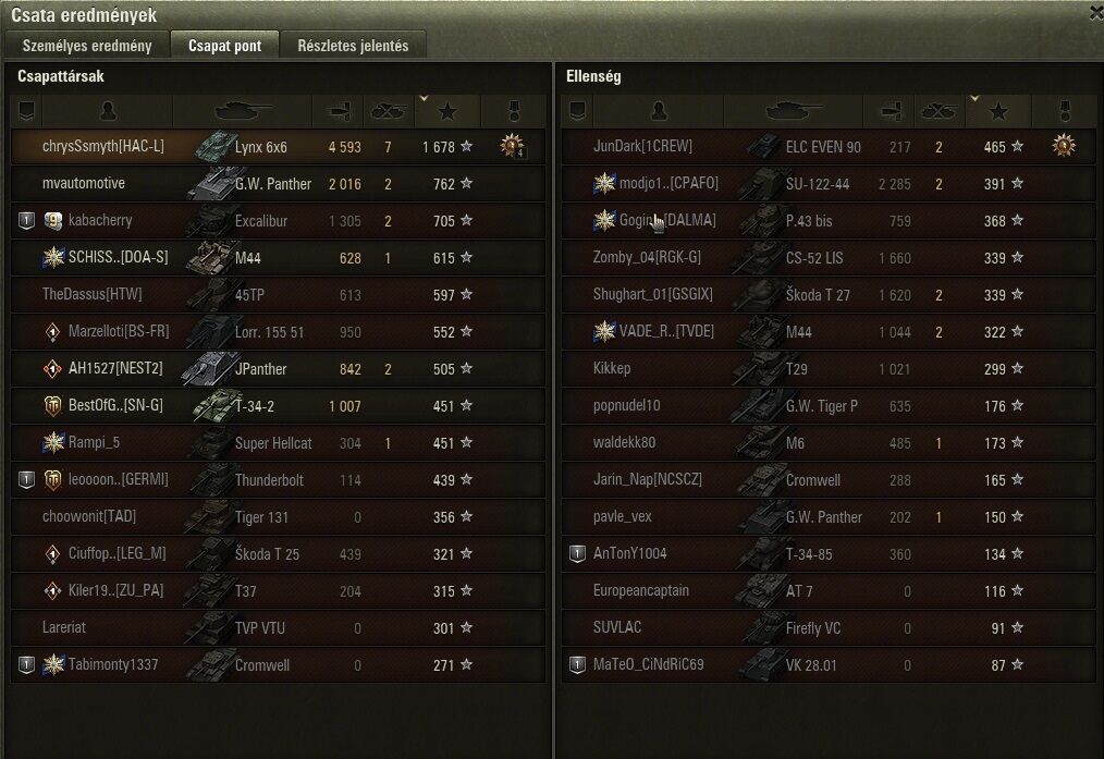 Mondom fogy a HP, ez így nem lesz jó, akkor guruljunk vissza a base irányába a heavyk mögé, ott nyerésre álltunk. Megyek hátul a bázis mögötti árokban, erre VILLAN a lámpa! WTF?!?!? Kiderült basszus, hogy az enemy kis geci ELV EVEN-je, a csata elején már középen fogta magát és senkitől sem zavartatva - 2 light is volt a csatában!!!! - simán átgurult a bázisunk mögé a bokrosba és onnan spottolt mindenkit aki a jobb oldalra ment a medes-td-s részre! 1 tudtam lőni bele, aztán kivégzett a kis szarházi, így ismét a 9-ik csatánál buktam el a küldetést!