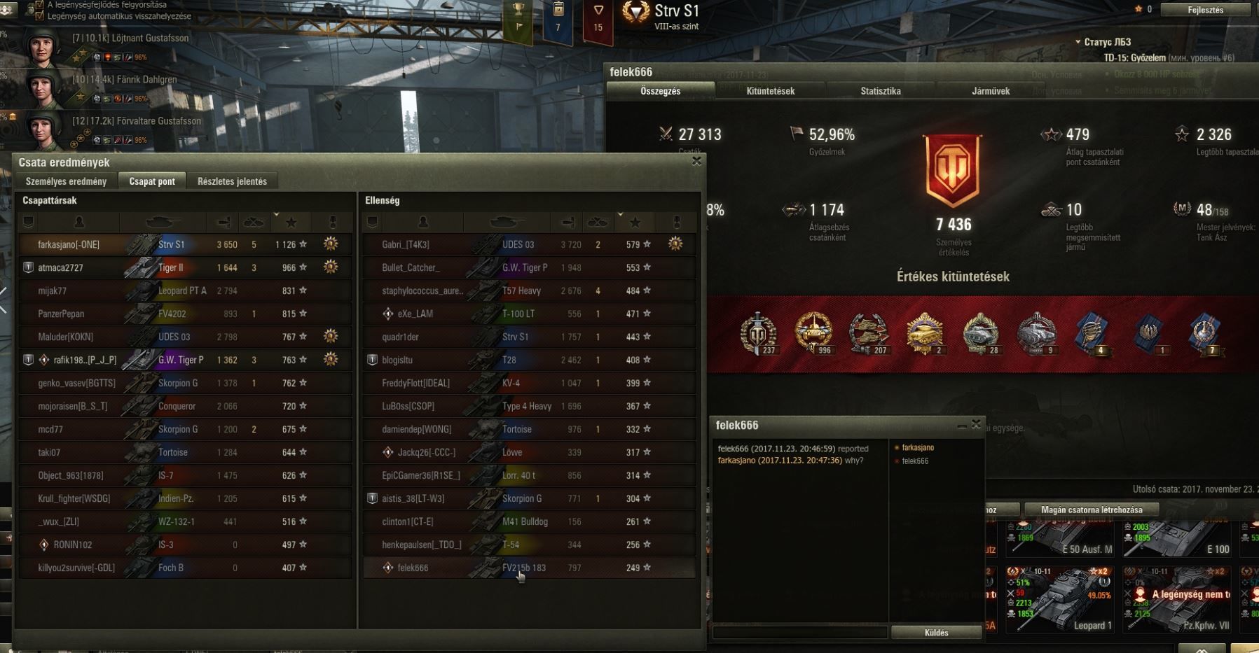 jó lenne tudni, hogy ez a debil FV 183b TD miért is akart reportolni!? 27K csatával sem tudja hogy működik a játék? Gondolom nem tetszett Neki, hogy vagy 4x lőttem meg úgy, hogy fogalma sem volt honnan is kapja az áldást. De ezért?!? Az ilyen felfogású embereket nem tudom megérteni - pedig haverok között is van egy - hogy azért repotol ellenfelet, mert az meglőtte többször is és nem látja, biztos csal! Akkor inkább ne nyomjon rá a CSATA gombra és nem fog lövést kapni vagy keressen másik játékot....nem!?