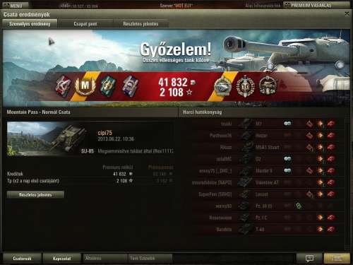 bár igazság szerint van ltp-m, az elvileg elég hasonló tudású, de azt se használom.Hát igen, a tier5 csaták kegyetlenek a pzs35-nek, de már olvastam, hogy ez valami hiba lesz, mert elfelejtettek tier limitet adni ennek a tanknak, csak kb lesz.rják, hogy kijavítsák. Mondjuk az igazság, hogy egy matildával sem lehet sokat kezdeni az alap 55 pennel, de még mindig jobb, mint a kv1, amit még a seggén sem tudok arannyal mindig sebezni. Úgy értem, hogy három lövésből egy biztos nem üti át a seggét, néha háromból egy sem, ha már valami minimális beforgatás van, ami azért durva. Vagy a másik szépség, mikor a full hp-s churchill jön, de azt legalább tudom sebezni, ameddig élek. Ezzel együtt azok a csaták kárpótolnak, amikor legalább a középben benne van. Azért 600xp a csata átlagom vele, majdnem 1000 csata után, ami szvsz nem rossz, tekintve, hogy az első 3-400 még vergődés volt és nem csak ezzel a tankkal, hanem mindegyikkel, mert csak tier4-nél jártam akkoriban. Számtalan top gun, radley-walters és mindenféle epic medál. Még most is néha előveszem, de már nagyon ritkán, mert nem álltam még neki komolyabban a német med vonalnak, majd idén valamikor.