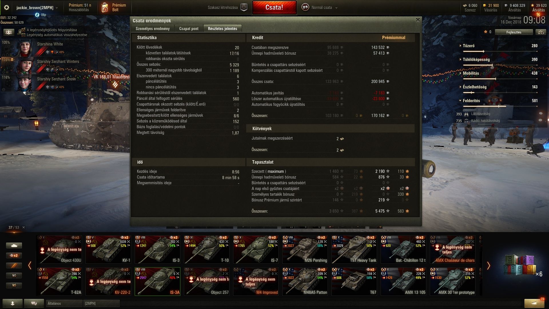 Ha ez vigasztal, ma nekem sem termett sok babér.. Vagy lemaradtam a sebzésről, vagy egyszerre 10-en ugrottak nekem. Ez van. Viszont legalább sikerült befejezni a X-es szintet, és hála a nyeremény csajoknak valamint a 11-es csomagból nyitott mikulás legénységi tagnak, lett egy komplett light tankos ( MT-25) full álcás és lámpás csapatom. Manapság minden kis dolognak örülni kell.