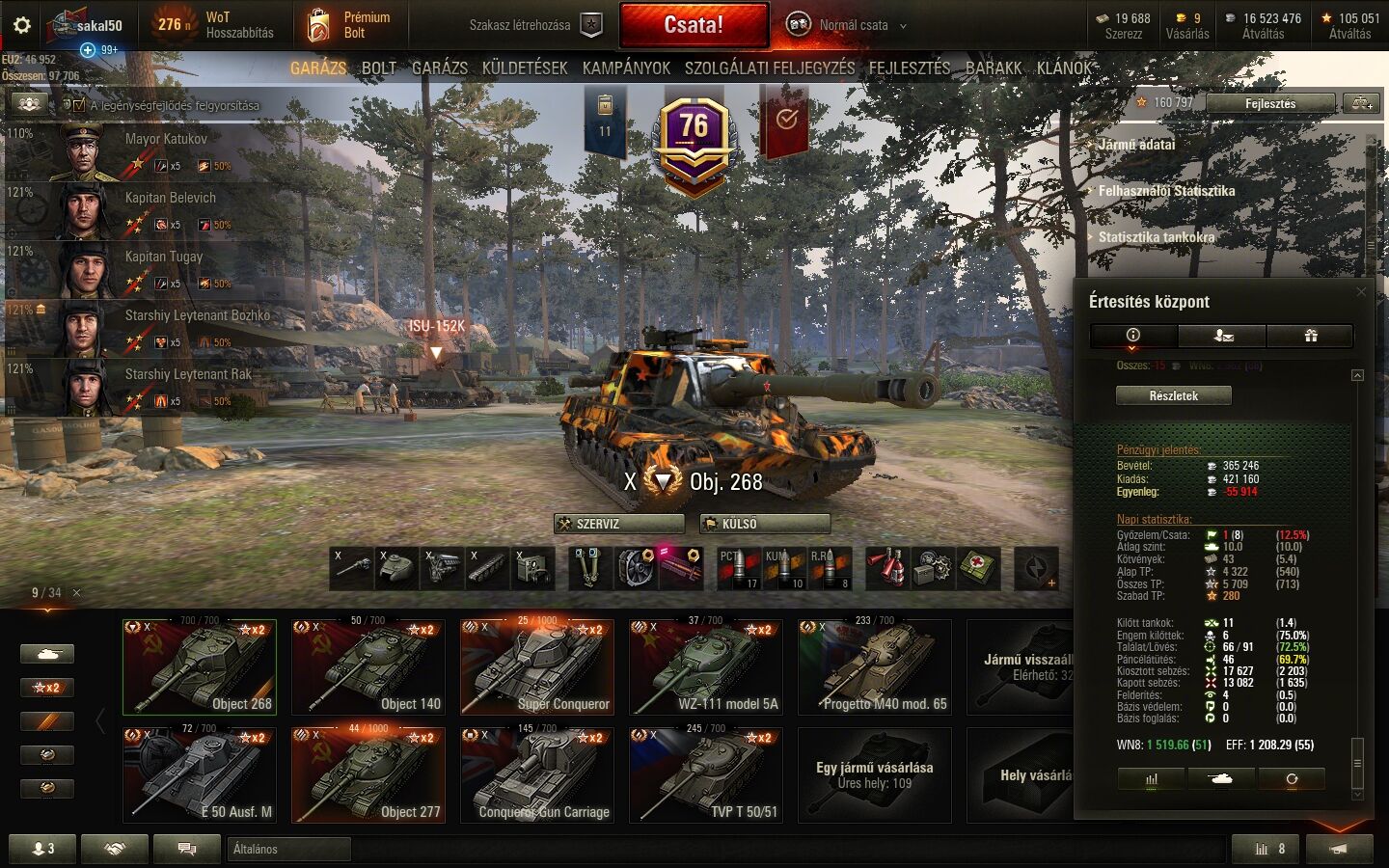Obj140-nel mentem pár kört, de annak az ágyúja sem volt az igazi, és legalább mindig ammorack-et kapott. Bónusznak még gyúlladékony is. Bár e két tulajdonsága a Pattonnak is megvan. De annak legalább fasza az ágyúja. WZ-vel is mentem párat, mert azt pont azért vettem meg, mert Skill azt mondta róla, hogy nagyon király. Én ezt annyira nem éreztem rajta. Nekem az IS7 jobban bejön a kettő közül. A nem goldozók illetve távolról lövöldözők ellen szerintem jobb az IS7 páncélja. Ha megnézed, az általam felsorolt tankok közül max. 1-1 van oldalanként. Nem véletlen, hogy mindenki a progettot, tvp-t, obj430u-t, obj277-et meg a SConquerort tolja. Plusz arty és ebr, de azok száma szerencsére limitált. Nem is értem azokat, akik e100-zal, JPZE100-zal jönnek rankedre. De az igazán hardcore user az Maus-zal nyomja.