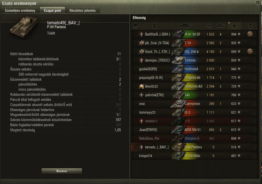 sajnos azonban az sokkal jellemzőbb, hogy nem ilyen kaliberű játékosokat tesz mellém a játék, hanem sokkal inkább olyat, mint az iménti csatában, ahol szerintem a WOT legnagyobb BOT-ját sikerült látnom - hála égnek az enemynél volt - aki 79K csata alatt azt nem tudta elérni, hogy legalább bevörösödjön!
