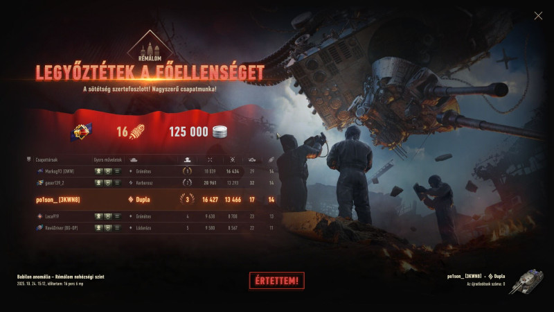 Más1: A nagy kalibert csak egy játékos kaphatja meg csatánként? Tegnap mentem egy kört IS7-el, az ellenfél össze HP ja 27000 körül volt. Sebeztem 5600 környékén amivel top sebző lettem a csapatban, de kikaptunk, és az ellenfélné volt egy játékos aki 7k+ sebzést hozott össze. Ő kapott nagy kalibert én nem.