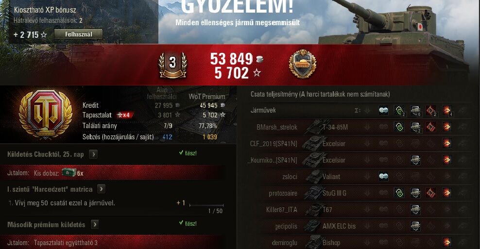 Na most, ha 60x megcsinálod összesen, tehát leghamarabb 10 nap alatt teljesíthető az "Előléptetés közeleg", akkor kapsz 75e legénységi xp-t arra tankra, amelyikkel a legvégén utolsónak teljesítetted a küldetést.
