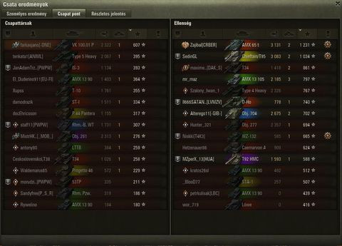 Tegnap volt egy csatám Lakevill-en, ahol a lightunk - AMX 1357 egy KÉK játékos - beállt A9-be egy bokor mögé! El gurult a gyógyszerem - nem ez volt aznap az első ilyen csatám - és oda gurultam mögé és elkezdtem tolni. Majd elkezdett menekülni és akkor kezdetét vette egy pár perces kergetőzés, ami közben néha mellé lőttem, hogy érezze a törődést. Mivel korábban is volt már tankba lövésem, nem mertem bele lőni, féltem a bantól, így pár perc kergetőzés után gondoltam, akkor megpróbálok hasznára lenni a csapatnak. A legvégén sajnos ez a barom egy IS3-al maradt szemben és volt olyan hülye, hogy szó szerint szemtől szemben próbálta meg kinyírni, de persze pattogott, mintha gumilövedékkel lőné! Annyi esze nem volt, hogy mikor az IS3 ellőtte magát és nem ölte meg, akkor mellé, mögé guruljon és úgy lője ki, mert már alig volt HP-ja amúgy. Csata jelentésnél mit gondoltok ki/kik voltak az első két helyen?! Igen, mi ketten! Úgy, hogy percekig csak kergetőztünk és nem foglalkoztunk az enemyvel. Mit csinálhattak a többiek - moziztak és rajtunk röhögtek vagy drukkoltak vmelyikőnknek?!