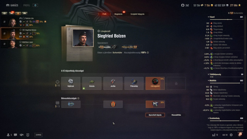 Én is nemrégen vettem csak észre, hogy a skillek alatt ott van 2 szám, az egyik azt mutatja, hogy a játékosok mekkora %-a választotta a skillt az adott a tankra, allatta meg az, hogy a profi játékosok, a WTR legend játékosok milyen arányban aktiválták. A WTR szerintem mérvadóbb, mert nekik gyakoribb a 6 skilles legénység. Az átlag azért lehet csalóka, mert sok embernek nincs is 6 skilles legénysége, bár ha meg 4 skillesed van, akkor az jobb. Meg pl a WTR játékosok nem aktiválják az arty detektort a parancsnokon, mert nekik abban a módban nem kell, normál játékban azért hasznos lehet. Ilyesmi eltérések lehetnek, de csak pár skill érintett.gyuri27: csak feltűnő nekem, hogy a t803-ra húzom a fejlesztést és vannak csaták, sok, és ez nem költői túlzás, hogy kizárólag arany lőszert lőnek rá. Szerencsére az átlagnál jobban védett a tank és csak elméleti síkon érdekel ez engem, mert én pl full arannyal durva égetést csinálnék.