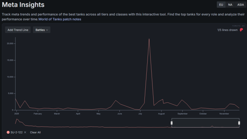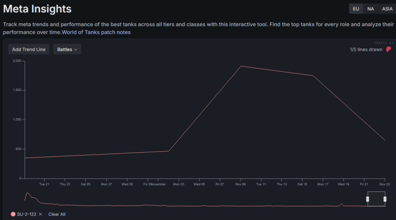 Ezen láthatod, hogy február és május közepe, illetve szeptember közepe és november eleje között heti néhány száz csatát mentek vele, a két időszak között pedig heti néhány ezerre felment vele a lejátszott csaták száma. Július közepén van egy nagy kiugrás, a naptárat visszanézve éppen akkor ment a dupla battle pass extra fejezet a TS-6-ért meg az IMT-ért. Valószínűleg ennek teljesítése miatt vehették elő ekkor a legtöbben az extra 15 pontokért.Ha belenagyítunk a közelmúltba, akkor ez látszik: