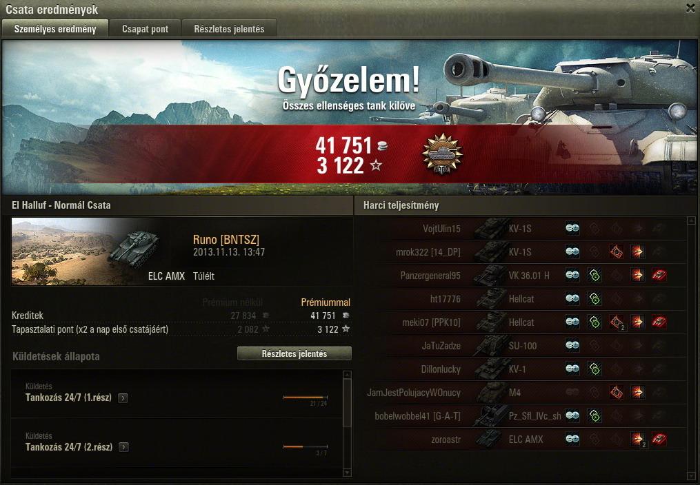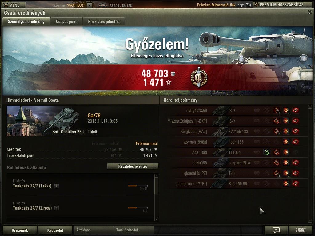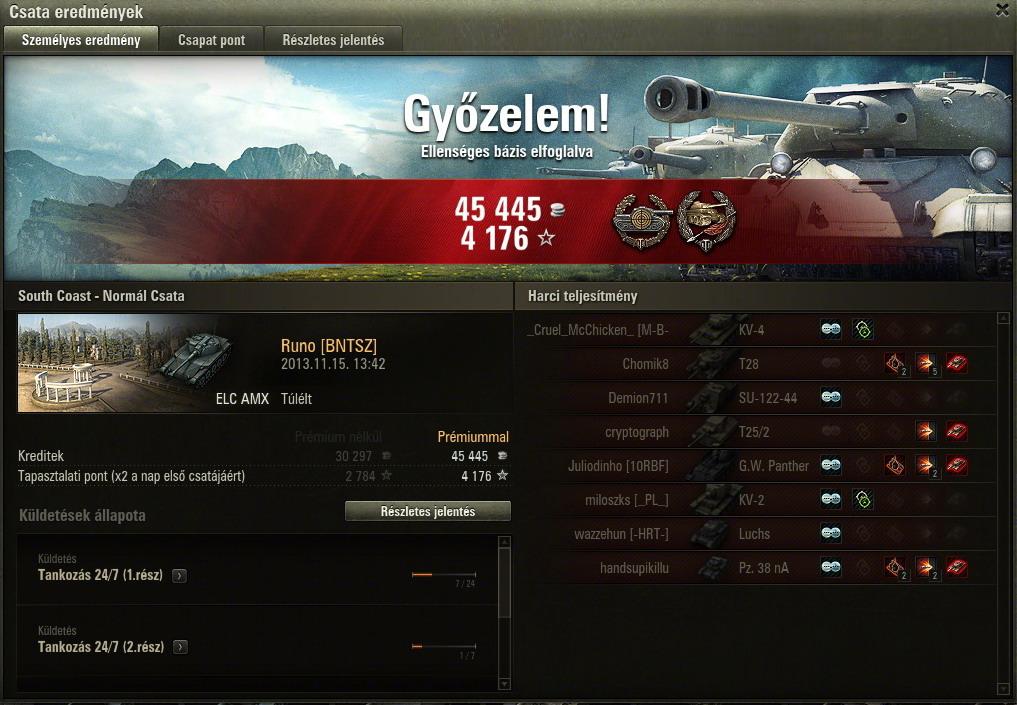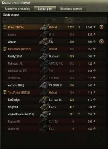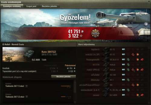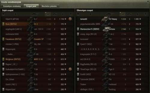 Most már úgy vagyok vele, hogy örülök, hogy nem adtam el ezt a tankot, persze azért azt még mindig nem mondanám, hogy jobb, mint a 121. Szerintem a 2 tank egyenrangú, mindkettőnek megvannak az előnyei és hátrányai. Már nem a tankot szidom a sok mellélövés miatt, hanem a játékot, hogy még 45 fps-nél sem mindig folyamatos a kép, megnehezítve így a pontos célzást.Megvettem az akció miatt a 110-et, stock-on ritka nagy szenvedés. Nem is magával a tankkal van a baj, hanem a szar D-25T-vel, ami teljes mértékben tönkreteszi a tankot. Komolyan el nem tudom képzelni, hogy egyesek hogyan szánják rá magukat, hogy 112-t/IS-6-ot vegyenek. De azt sem értem, hogy miért istenítik annyira az emberek azt a szar KV-1S-t, amikor arra még vert stab sem megy, ergo a már így is évekig tartó célzás még rosszabb. 19k még a nagy löveg, köszönhetően a nagyrészt jó teambattle csapatoknak köszönhetően 2 nap alatt jutottam ide prém nélkül.