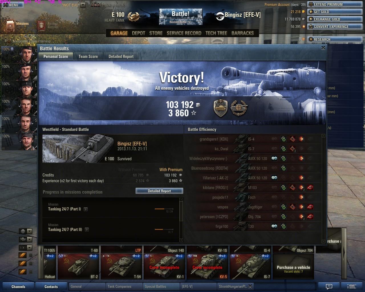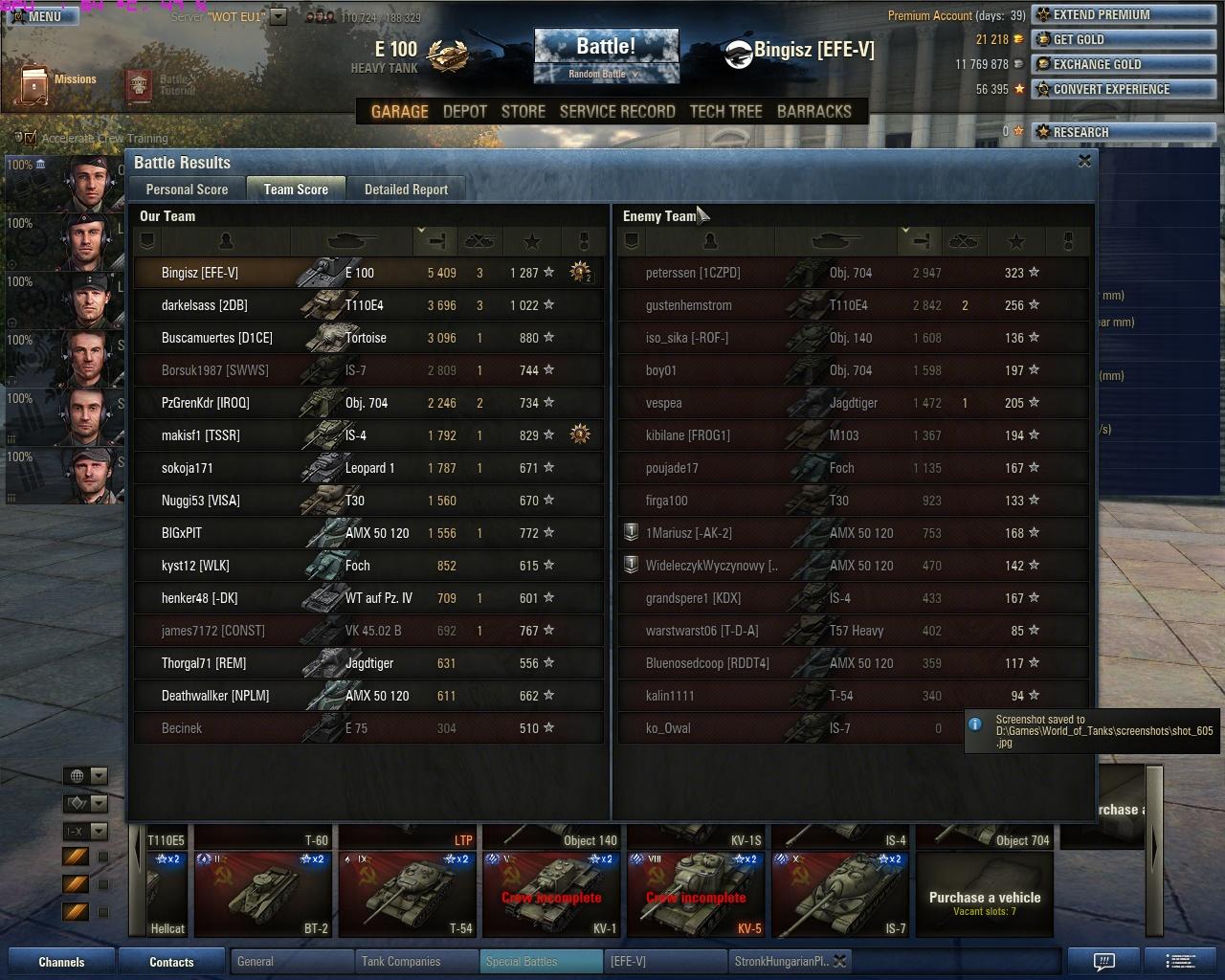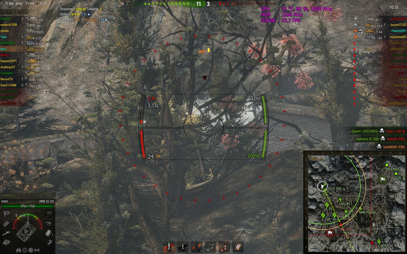 Most már úgy vagyok vele, hogy örülök, hogy nem adtam el ezt a tankot, persze azért azt még mindig nem mondanám, hogy jobb, mint a 121. Szerintem a 2 tank egyenrangú, mindkettőnek megvannak az előnyei és hátrányai. Már nem a tankot szidom a sok mellélövés miatt, hanem a játékot, hogy még 45 fps-nél sem mindig folyamatos a kép, megnehezítve így a pontos célzást.Megvettem az akció miatt a 110-et, stock-on ritka nagy szenvedés. Nem is magával a tankkal van a baj, hanem a szar D-25T-vel, ami teljes mértékben tönkreteszi a tankot. Komolyan el nem tudom képzelni, hogy egyesek hogyan szánják rá magukat, hogy 112-t/IS-6-ot vegyenek. De azt sem értem, hogy miért istenítik annyira az emberek azt a szar KV-1S-t, amikor arra még vert stab sem megy, ergo a már így is évekig tartó célzás még rosszabb. 19k még a nagy löveg, köszönhetően a nagyrészt jó teambattle csapatoknak köszönhetően 2 nap alatt jutottam ide prém nélkül.