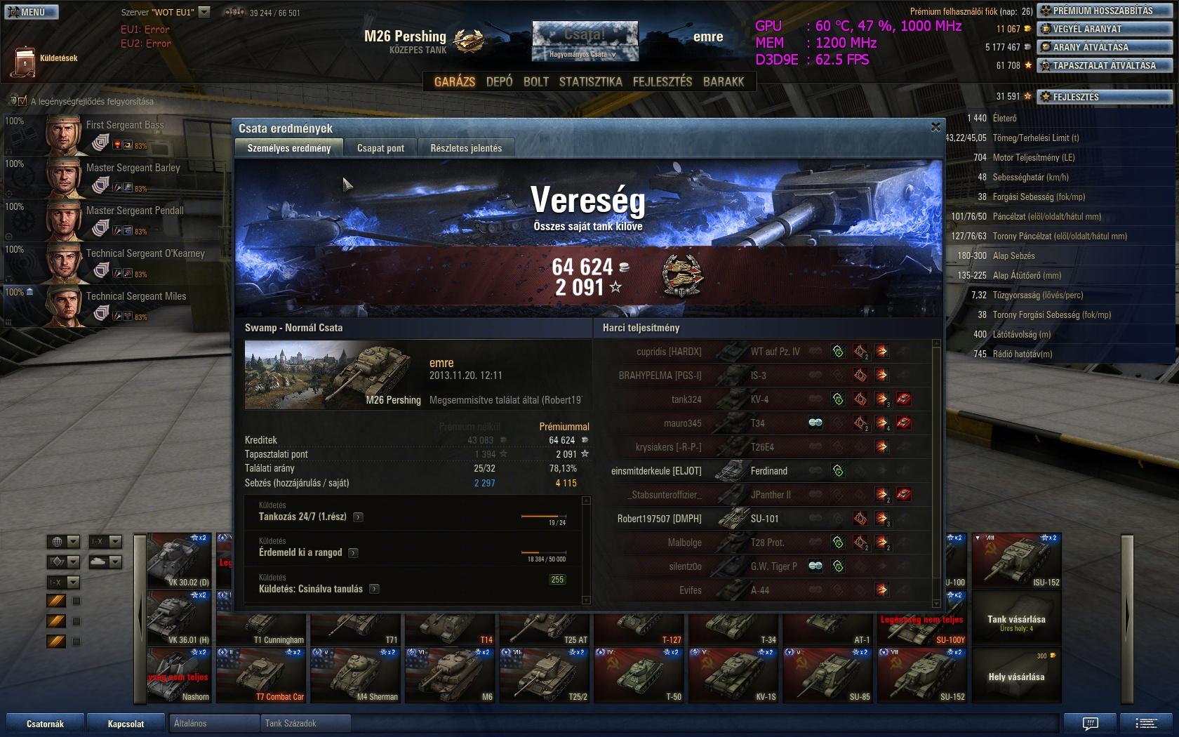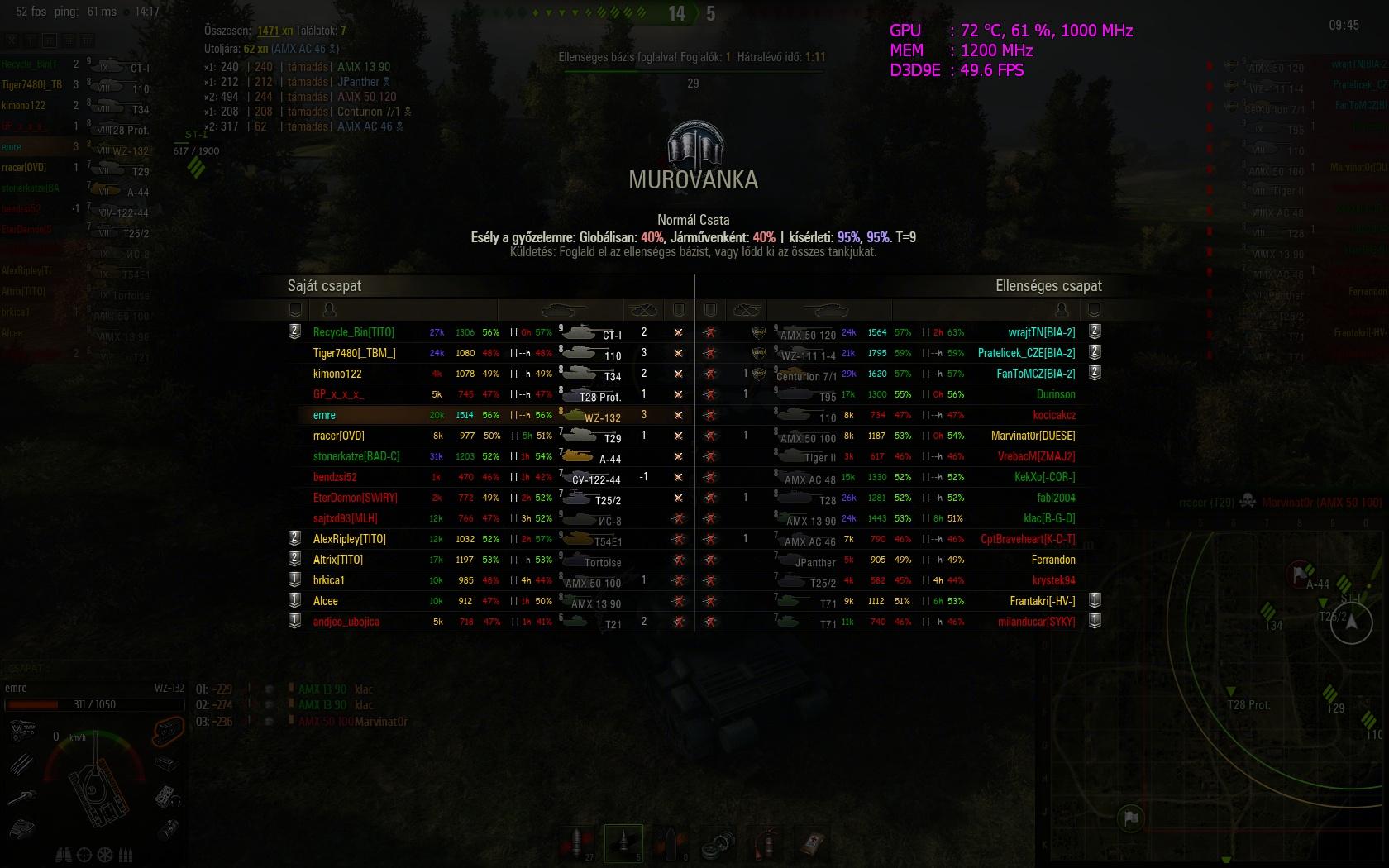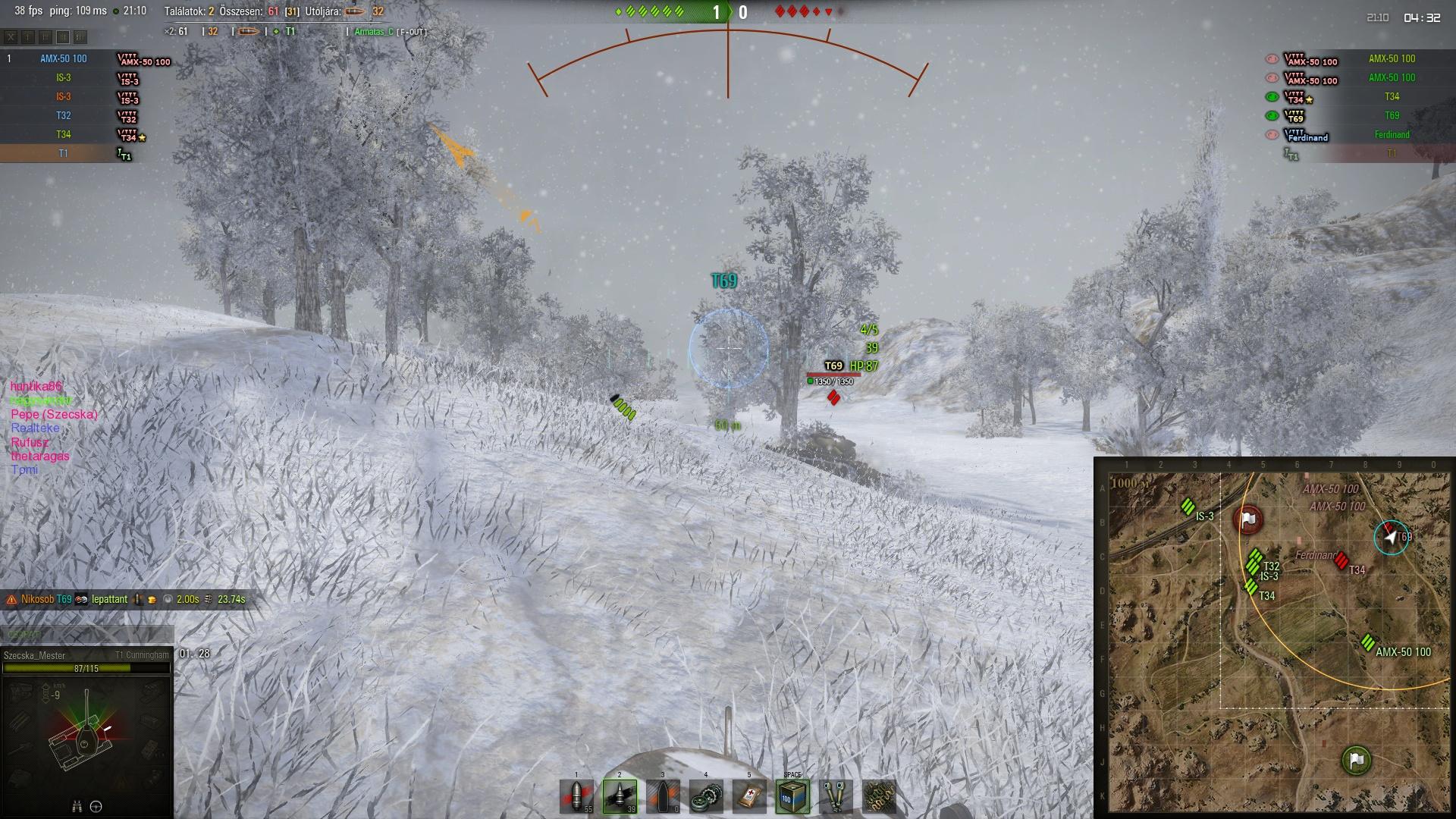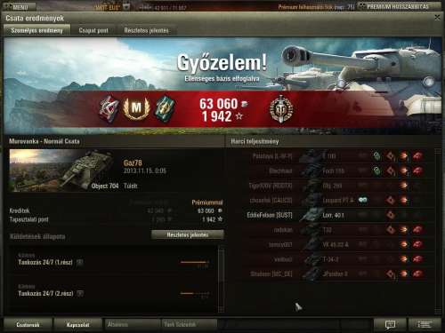 - T-62A 6108 sebzés Nem akarom elkiabálni, de talán kezdek megbarátkozni ezzel a tankkal. Mostanában egész jó köröket lehet vele menni, bár még így is csak vereségek. Azért viszont még mindig haragszom rá, hogy rengeteg mínuszt hoz, hiába próbálok minél effektívebb lövéseket leadni. Eddig az mentette meg az eladástól, hogy az egykori -HHR- klán kérésére annak idején raktam rá egy gold nyári festést, na meg talán az is, hogy ez az egyetlen egy T10-es med tankom.