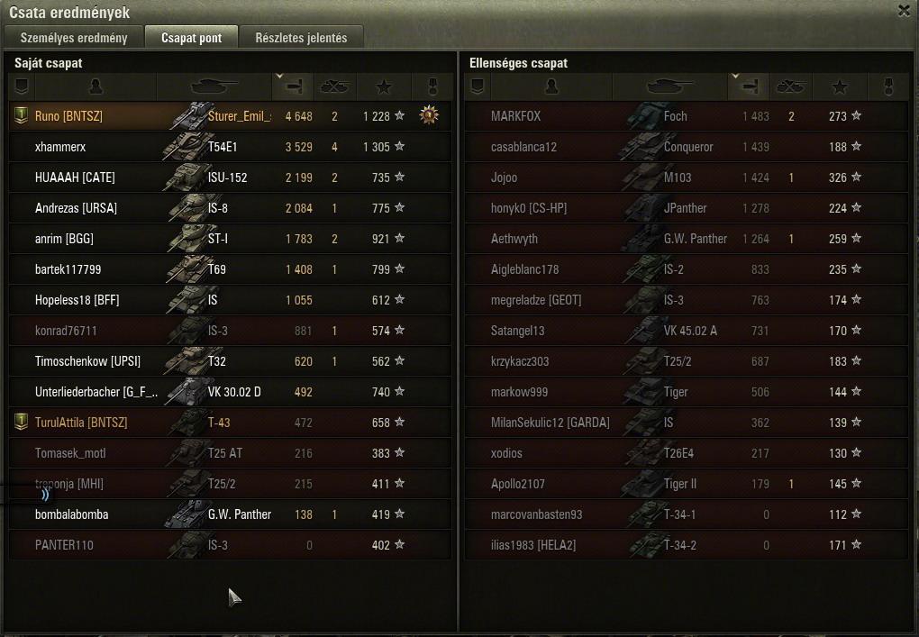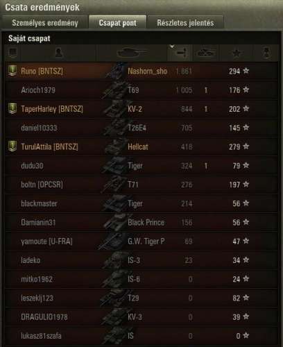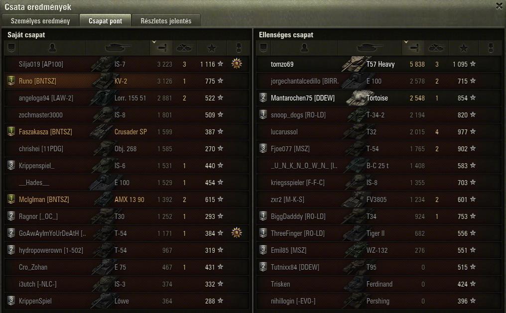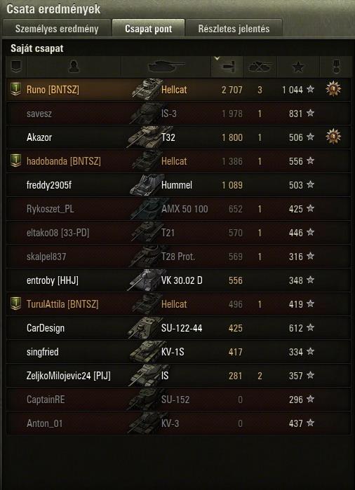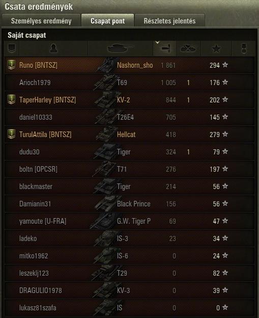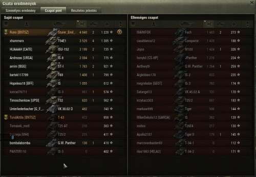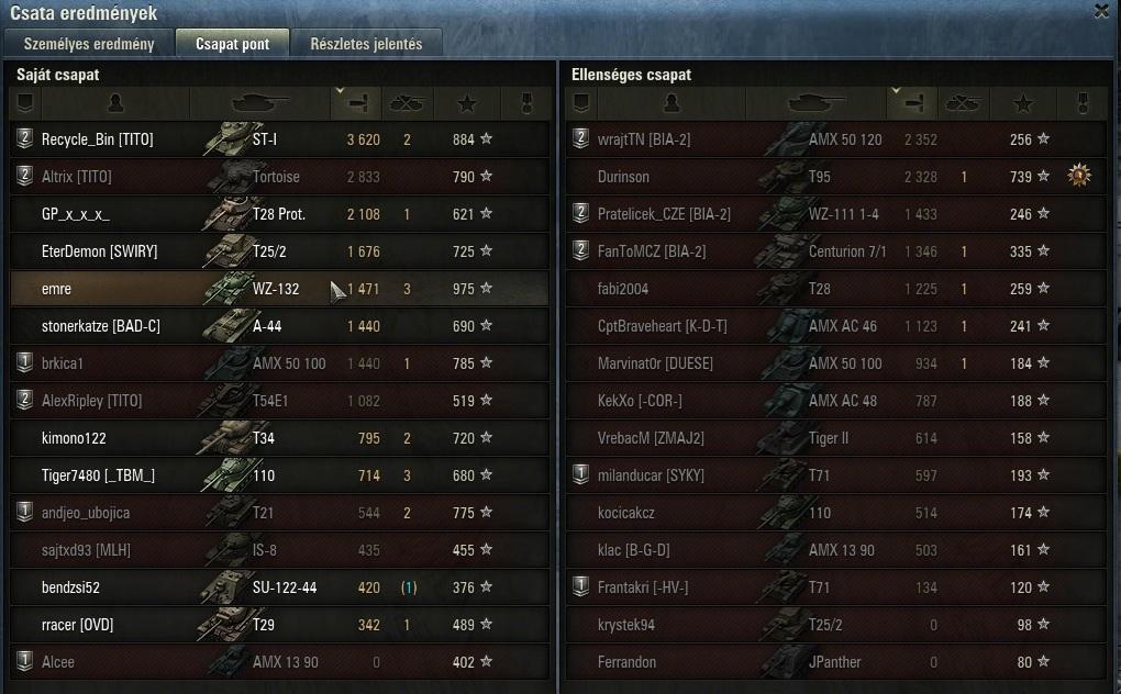 ennek 14 és fél perc után lett vége, vesztettünk annak ellenére h az artynk 7000et sebzett, de amúgy elég vicces volt h 3/4 életről leszedett a végjátékban 2 lövéssel a jgpz100, és az e4.Mivel nekem kellet spotolni, mert ugye frankónk tele voltunk ezekkel a mocsok tdkkel...