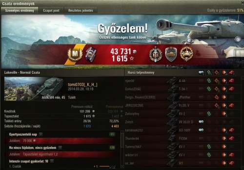 Végre befejeztem a játékot azzal a fostaliga M4 45-tel. Ilyen hulladék tankkal én még nem mentem... Mondjuk a régóta gyűjtögetett freemből 20k elment a fejlesztésre, meg az 50 100-ra egyből rátettem a nagy ágyút meg a láncot szóval fullos.