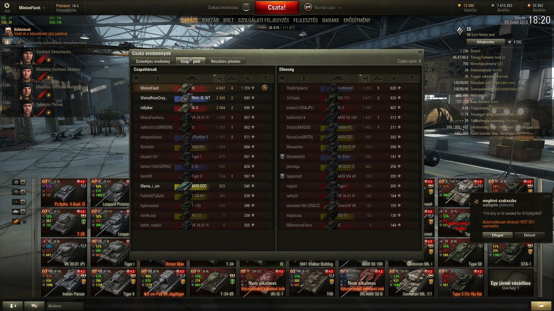 FreeXPbol ratettem a lanctalpat, tornyot, felkerult a nagy csuzli, ami megvolt az ARL44-rol.A feneket, akarhanyszor ramnez egy IS/T29/akarmi, minusz 300HP-rol indulok, mig nekem csak 240 az alpham, es jo fhanszia szokas szerint szeret melleloni/pattanni...