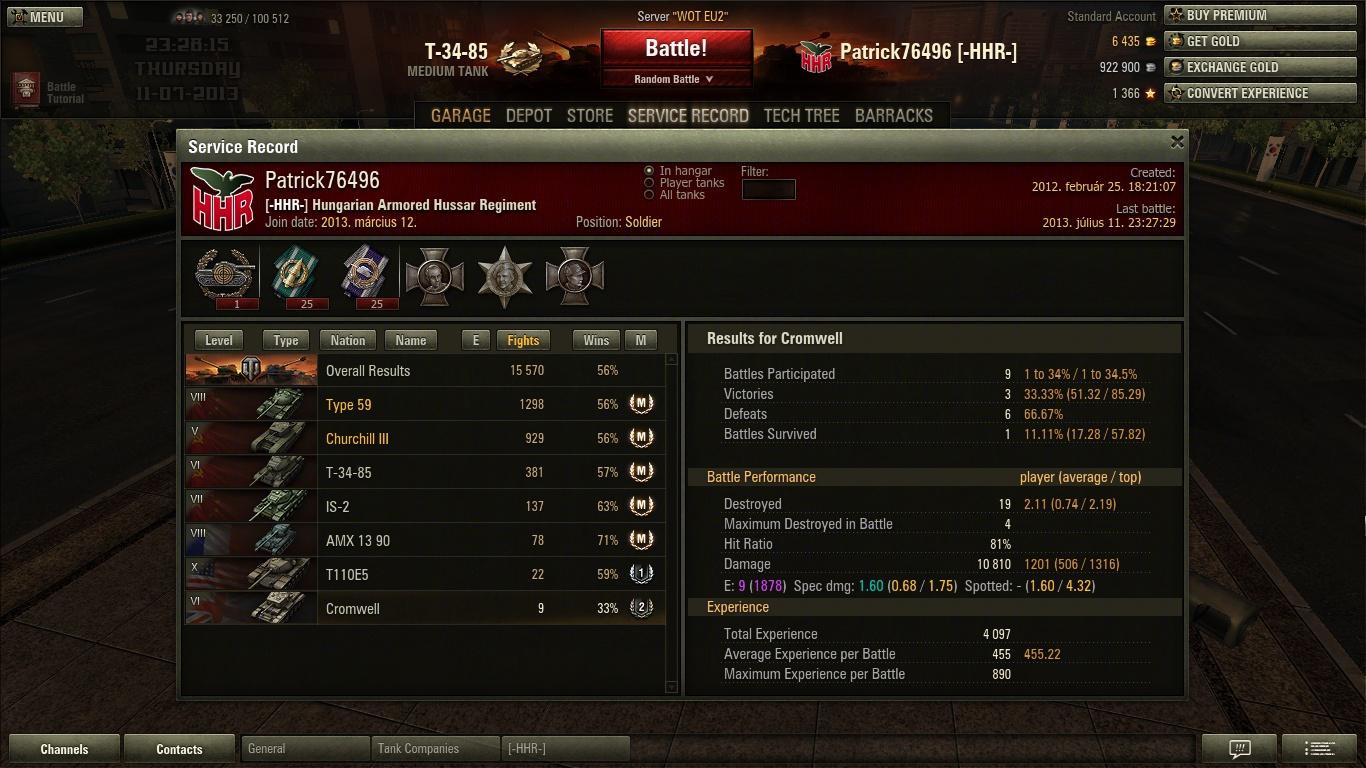 Credits total 318 996Vesztes csatákért átlagban 835 xp...