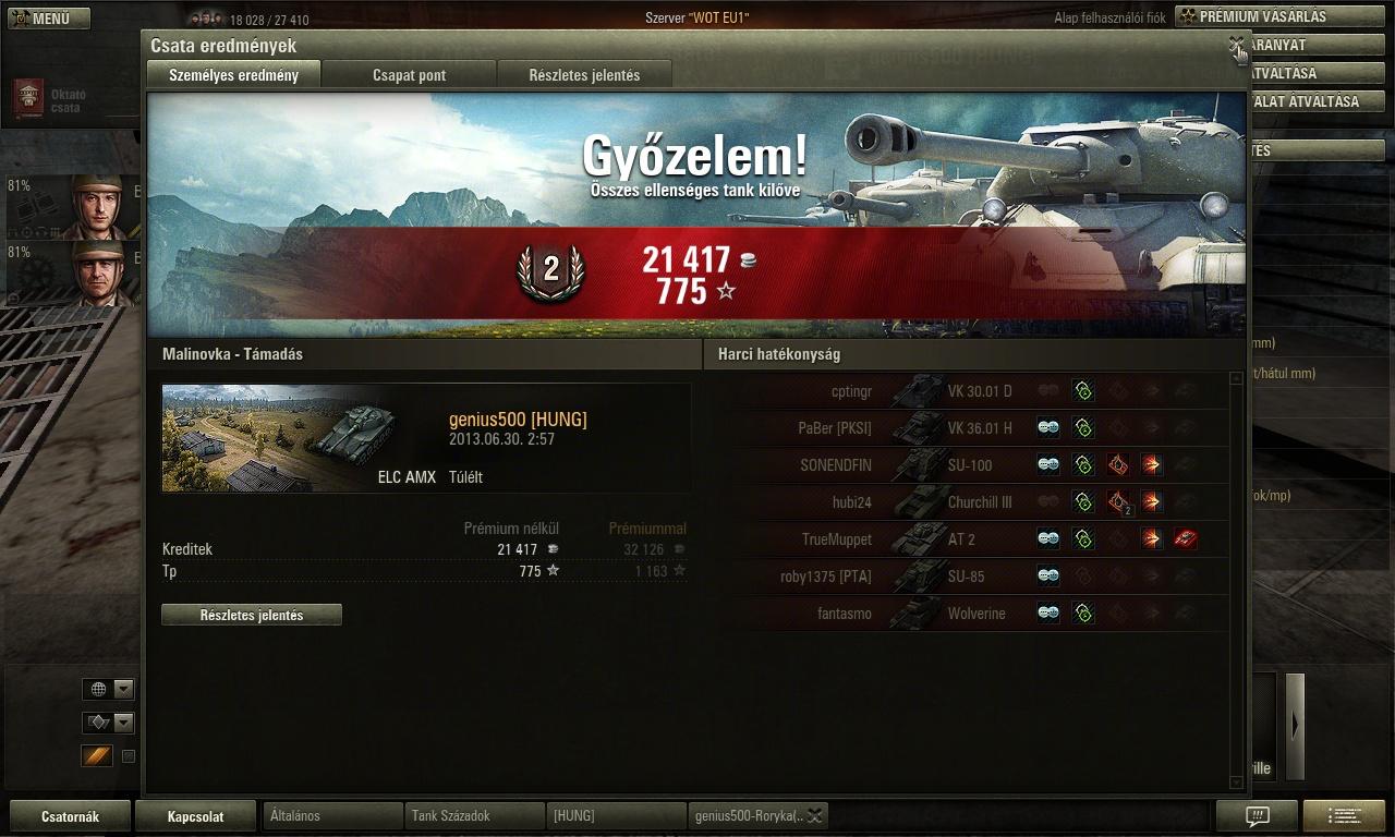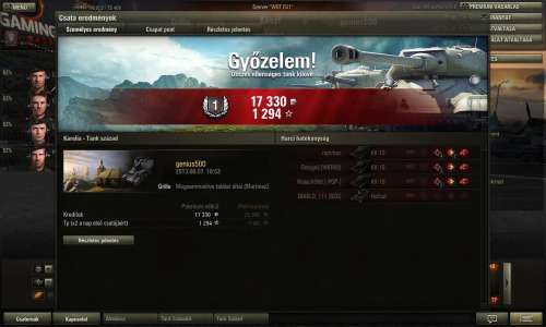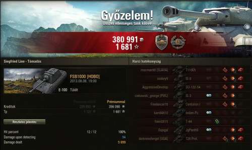E100-al 21800 potenciális elszenvedett sebzés, az azért nem olyan rossz és még így is vesztettünk. Egyedül, beforgatva feltartottam 6 ellenséges tankot de a csapatom másik része a fölényes létszámelőny mellett is elpusztult és még így is utolsónak maradtam. Elképesztő ez a színvonal, komolyan mondom.