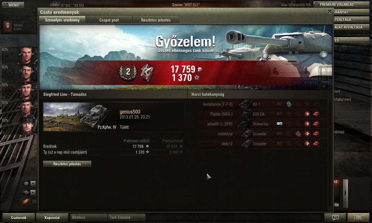 Tegnap csak pár csatára futotta, de egész jól ment. Sajnálom, hogy nem tudtam többet játszani. 9-ből 6 csata IS-2-vel, 2 Ferdivel és 1 JT-vel volt.