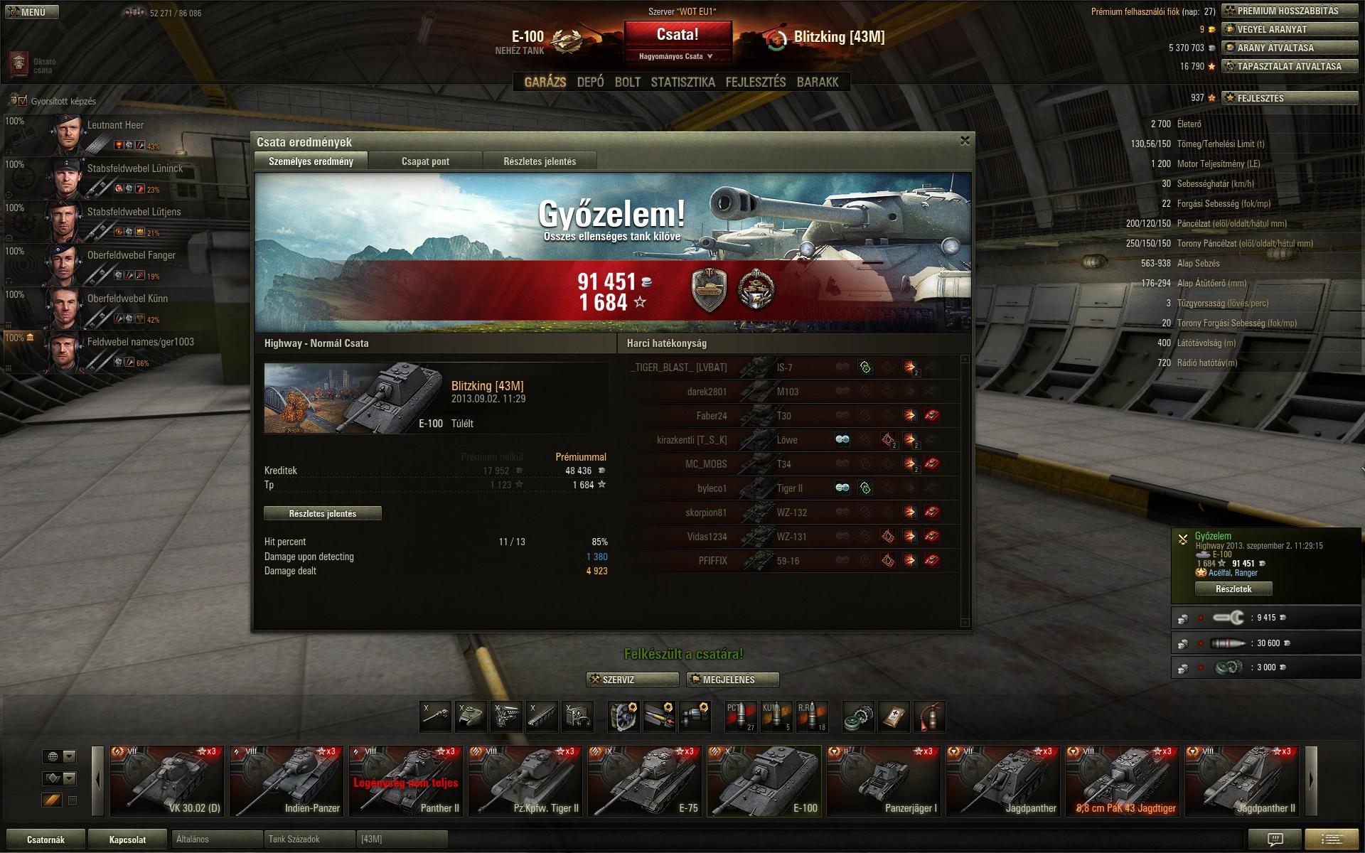 Gondolom böki a wg csőrét, mert túl jól teljesít. Nekem még csak 200 csatám van vele, mert E100-ra váltottam (minimális free xp-t kellett csak felhasználnom, de az akció miatt léptem feljebb), de nem adtam el, és megcsinálom majd az ászt is rajta (jelenleg első osztály van). Érdekes, hogy több az átlagsebzésem az E75-el, mint az IS7-el vagy az E100-al. hm, pedig igyekszem odatenni magam tier 10-ben is, de az E75, jól beforgatva egy bunker. Kedvencem vele az utcai harc, nem kell oda sidescrap, csak kidugom az orrát olyan szögben, ha meglövik pattint vagy max a lánc le, de 100% javításnál gyorsabban javítok, mint ahogy az ellenfél tölt, úgyhogy jó móka. Kapja az 500hp-s puszikat, aztán újra, lánc le, javít, megint puszi