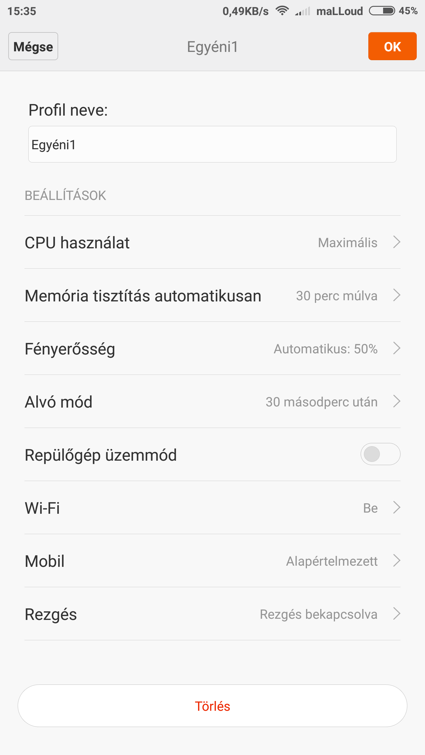 Én még mindig úgy érzem máshol jártok, ez itt szerintem a Settings / Additinal settings / Battery & performance / (1. sor) Power menü és ott profil létrehozása.