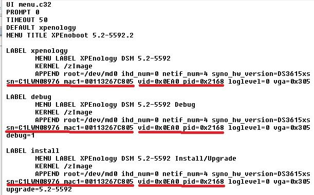 A xpenoboot ot írd ki pendrive-ra, módosítsd a syslinux.cfg-t, (generáld le a DS3615xs-nak megfelelő SN és MAC1 párost) A mac1-et kötőjelek nélkül írd be! Módosítsd a pennek megfelelőre a Vid Pid értéket, hogy ne lássa megosztható meghajtónak a pent a DSM.